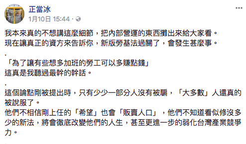 ▼1月10日,「正當冰」老闆發表長文,娓娓道來勞基法修法後,可能會發生的怪事。文章一開頭便犀利地大嗆政府:「『為了讓有些想多加班的勞工可以多賺點錢』,這真是我聽過最幹的幹話。」