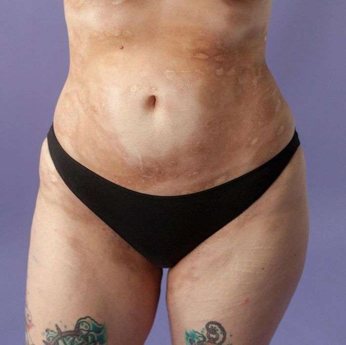 Hannah的傷疤來自于硬斑病,一種自身免疫性疾病,皮膚會不斷產生這些瘢痕,她正在學習如何去愛它們,每一個瘢痕都是身體的一部分,每一個新的瘢痕,時刻提醒著她正在經歷一場戰鬥。