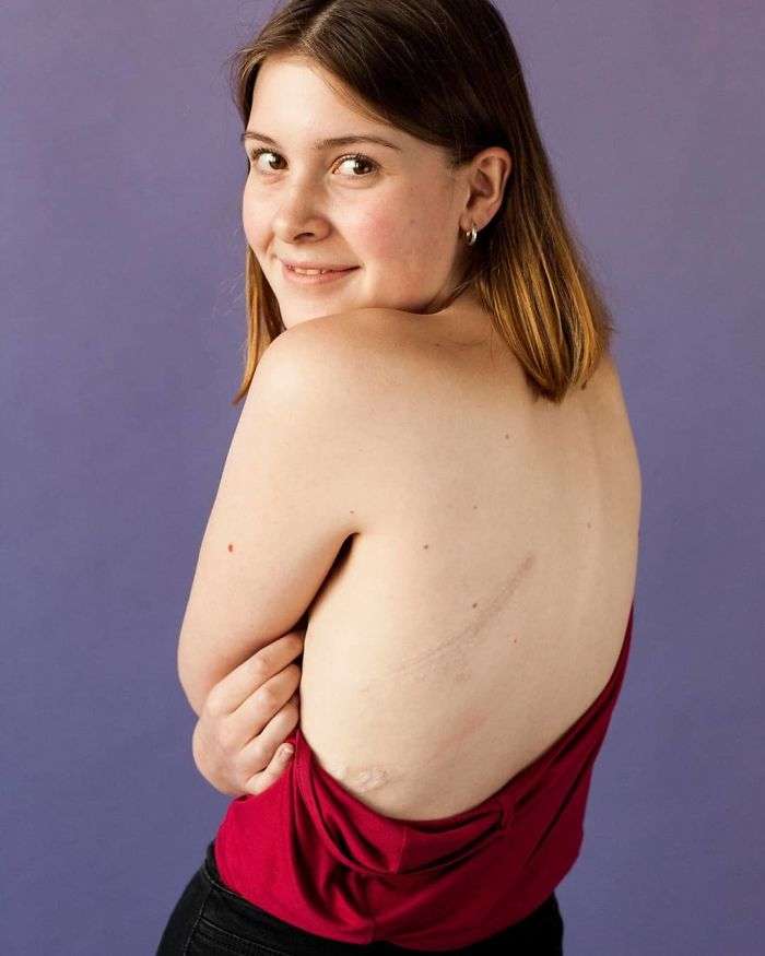 大學畢業後的第一天,Helen被診斷為先天性心臟病,通過心臟修復手術,留下了這個像「拉鏈」一樣的疤痕,她坦然接受發生在自己身上的事,並為疤痕感到自豪。