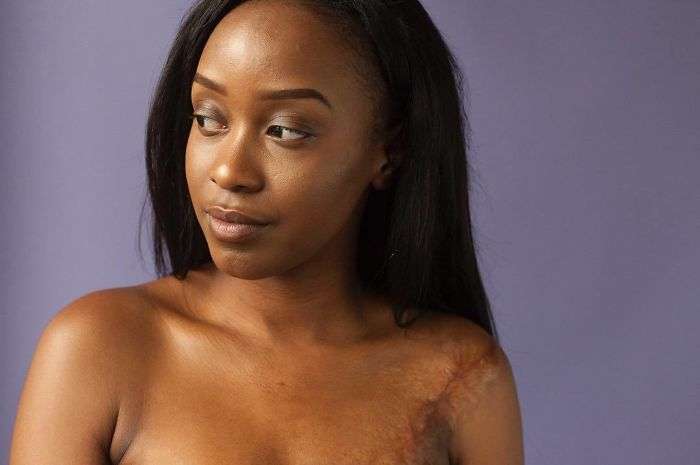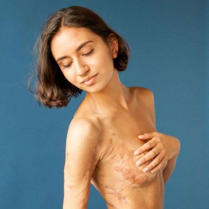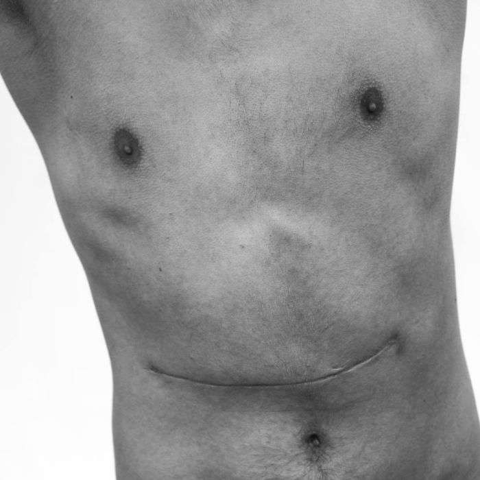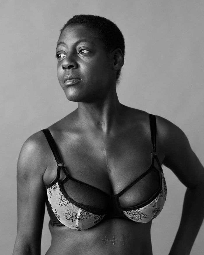 2014年,Barbara被診斷為乳腺血管肉瘤,一種罕見的侵襲性癌症,經過三次手術和兩次化療后,留下了這些傷疤。最近還要接受新的手術,去除胸骨和四根肋骨,她花了很長的時間來適應傷疤,現在她感到很安心,這些傷疤記錄她的生命旅程和從沒想到的勇氣和力量。