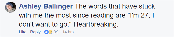 到那一天你會明白,這就是生活,生命是那麽脆弱、那麽可貴。你不知道接下來會發生什麽。每一天都是禮物,而不是理所當然的!我現在27歲了。我不想就這麽死去。我熱愛我的生活。我知道我欠我的親人們太多太多了,但我卻無力償還。
