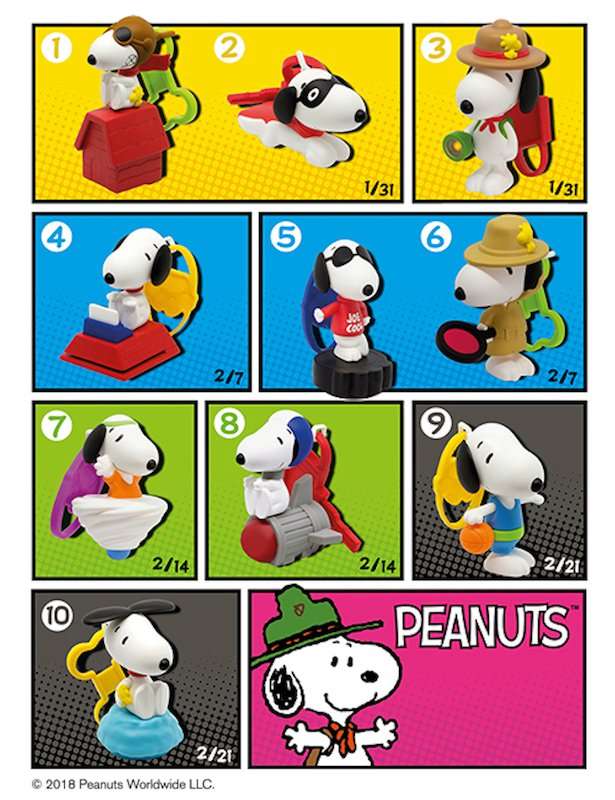 ▼除此之外,從1月31日起連續4週,麥當勞與PEANUTS還聯手推出了10款「快樂兒童餐」隨餐附贈玩具,都是可愛的史努比造型。飛行員史努比、蒙面俠史努比…每一款都很吸睛。這些小玩具帶有互動小機關,很適合拿來消磨時間。