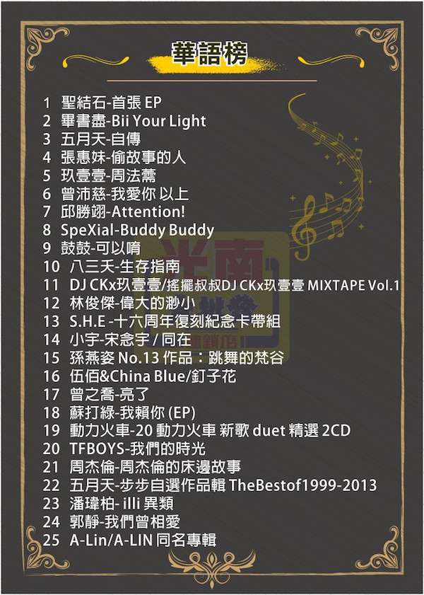 ▼從光南大批發公開的2017年銷售排行來看,聖結石發行的「首張EP」奪下第一名,第二名則是2018年台北場跨年演唱壓軸的畢書盡,其次則是出道多年的五月天、張惠妹,還有中部霸主玖壹壹。