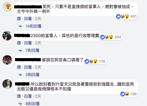 ▼但是仍有網友質疑,總額138萬台幣中,只有2300元實際捐給了當事人,總體的金錢流向太可疑。讓人不禁質疑「2300給當事人,其他的是行政管理費」、「都捐在狗官員口袋裡了」。