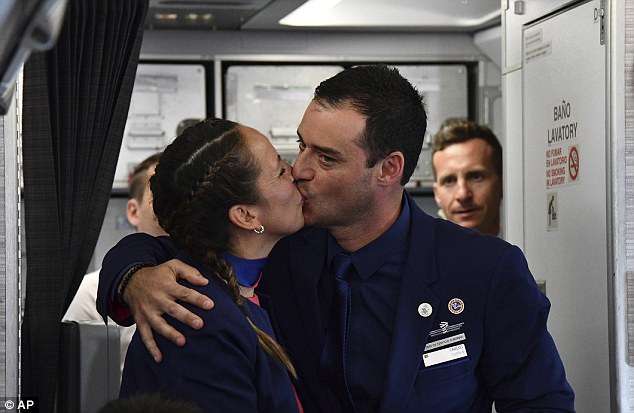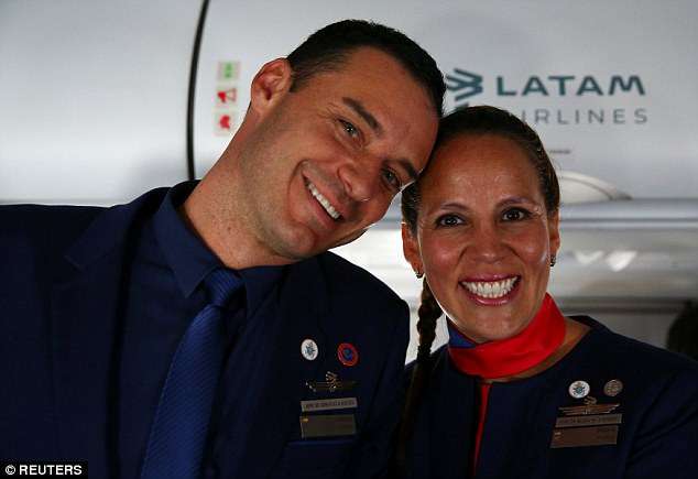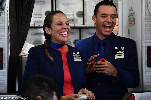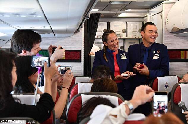 ▼寶拉和卡洛斯都不敢相信這樣的好運,在教宗的見證下,他們真的在飛機上舉行了一個小型的天主教婚禮。航空公司的老闆成為他們的見證人,機上的乘客則成為他們的「賓客」。