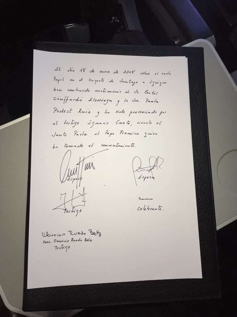 2018年01月19日天主教教宗方濟各近日到智利巡迴,再搭乘智利國內線航班時,兩位空服員向教宗懇求,可否給予他們的婚姻祝福,沒想到教宗反問說:「你希望我證婚嗎?」讓他們驚喜答應,也成為「最接近上帝的婚禮」!