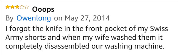 ▼13.我忘記把這把刀從我的衣服拿出來,然後我太太拿去洗結果我們整台洗衣機就炸了。(其實這把刀也可以洗衣服啦,不用放在洗衣機。)