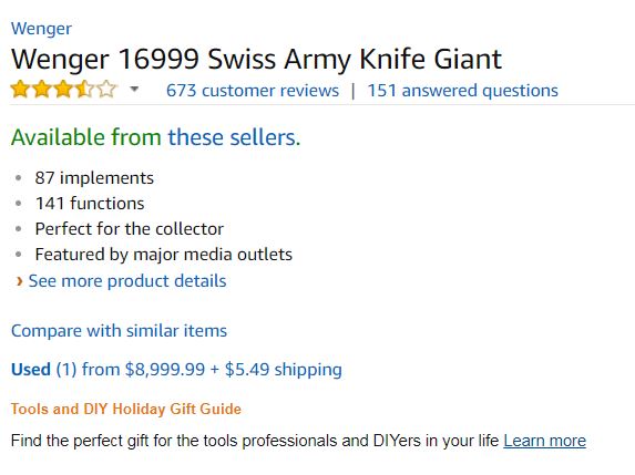2018年01月21日網路上購買東西超方便,貨比三家不吃虧,所以網路評價就是一個超重要指標,許多店家也都不惜買廣告跟關鍵字讓自己的商品搜尋位於前幾名。而在亞馬遜購物網上,有一隻要價9000美金(27萬台幣)的全功能瑞士刀,大家看到他的造型跟價格之後,都忍不住惡搞了!