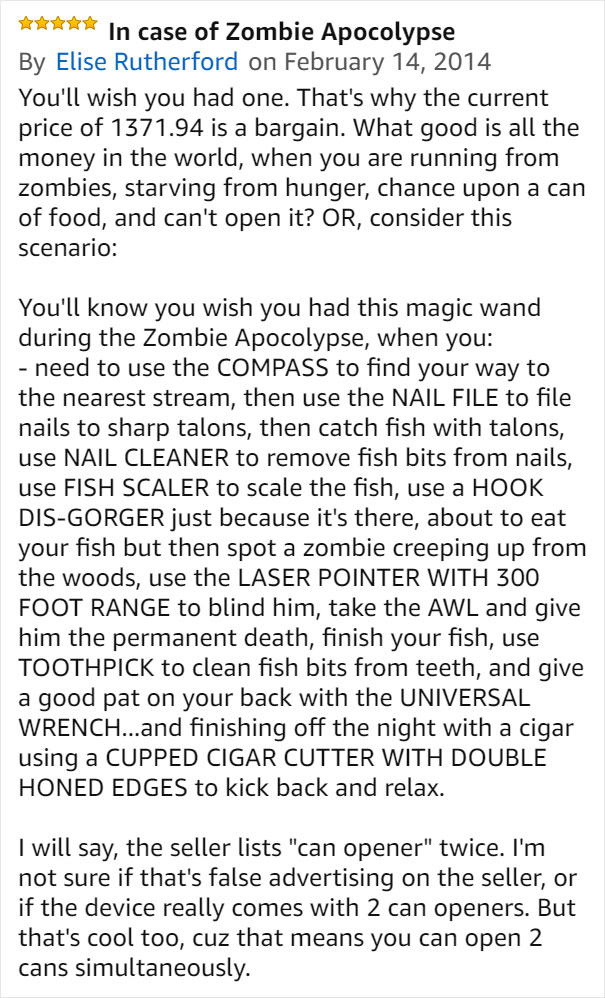 ▼33.如果在喪屍來的時候,你真的會很想要它,這也是為什麼現在這個價格已經是特價了。錢當然超棒的,但如果今天你要逃離將屍的時候,你可能會剛好需要開個罐頭食物,但不能開的時候呢?所以你應該要把這個考慮進去。這把瑞士刀裡面,你可以用羅盤來辨明逃跑方向去最近的水源地、然後用指甲剪來剪成尖尖的指甲,就可以用來抓魚,再用卸甲油來清除指甲中的魚味,再去掉魚鱗,然後用魚鉤掛魚,當你都準備好準備要開動的時候,這時候殭屍來了!用雷射槍射那些僵屍的眼睛,把它們弄瞎,再置他們於死地,雖然他們已經死過一次了。你就可以好好的享受你的魚,然後用牙籤剔牙,再用萬能板手來拍個背,鬆一下,最後再用雪茄剪叼著雪茄結束這個夜晚。然後,在列表中有把開罐器列了兩次,不確定是誤植還是真的有兩個開罐器,如果真的是兩個那就超棒的,因為你可以無限次的同時開兩次罐頭。(是497頁的忠實讀者呢。)