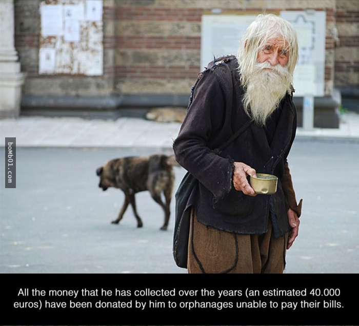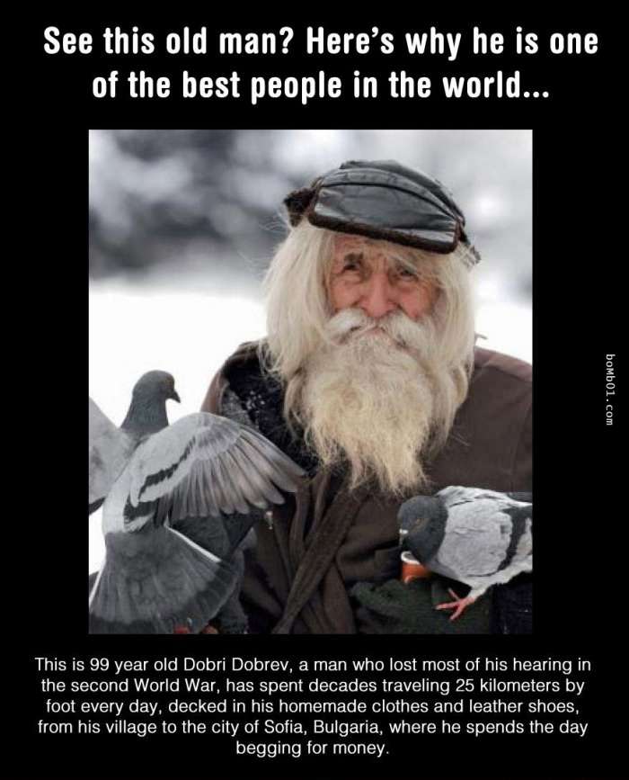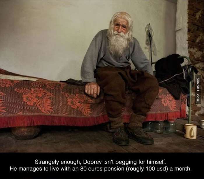 ▼這位99歲的老人叫多布裡·多布雷夫,他在二戰中喪失了絕大部分聽力,幾十年來,他每天穿著自己做的衣服和鞋子,跋涉25公里的路,從自己的村子走到保加利亞的首都索非亞,然後在那裡乞討。多布裡很奇怪,他不為自己乞討。他一個月只花80歐元(大約100美元)。