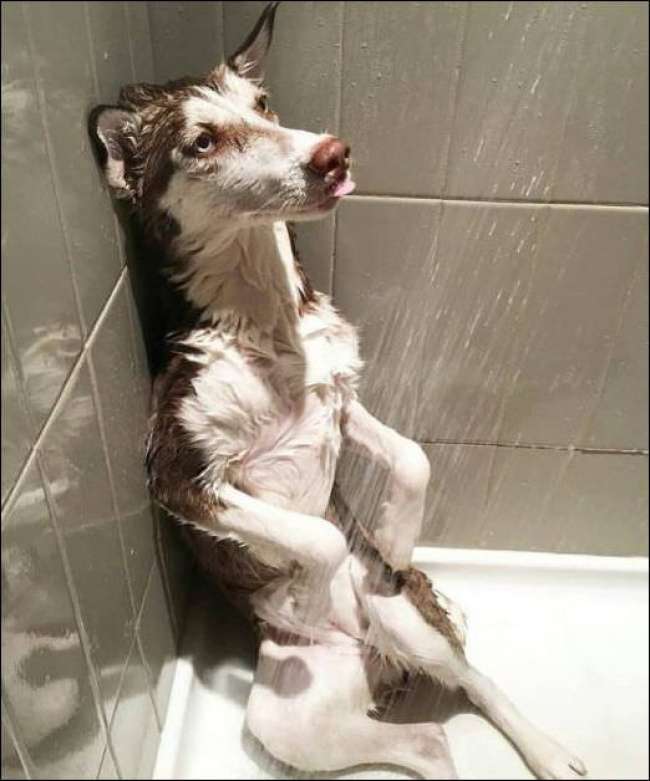 ▼這隻狗狗超愛淋浴,牠大概看過不少悲傷的電影吧。