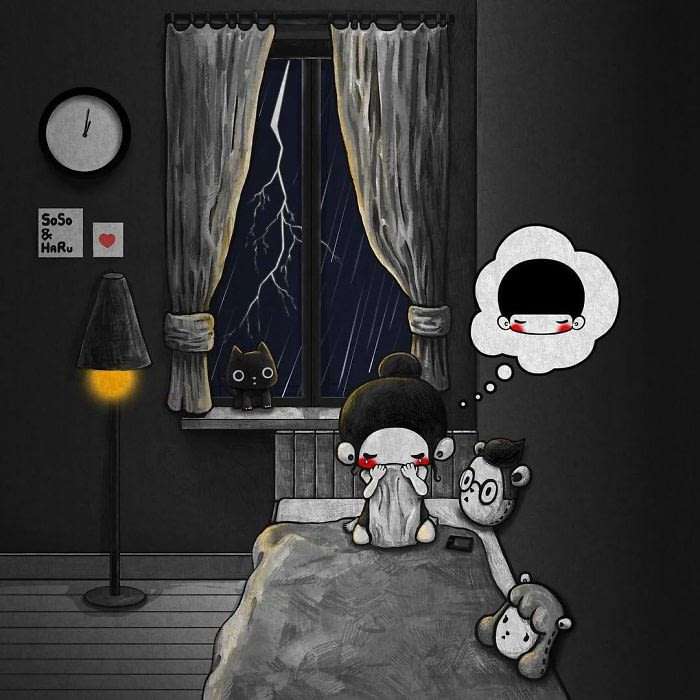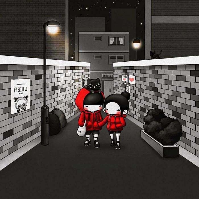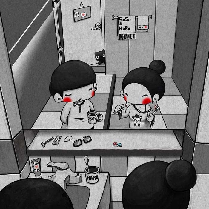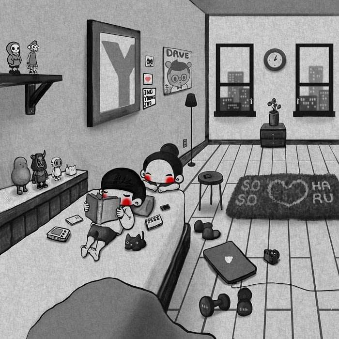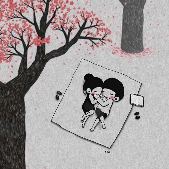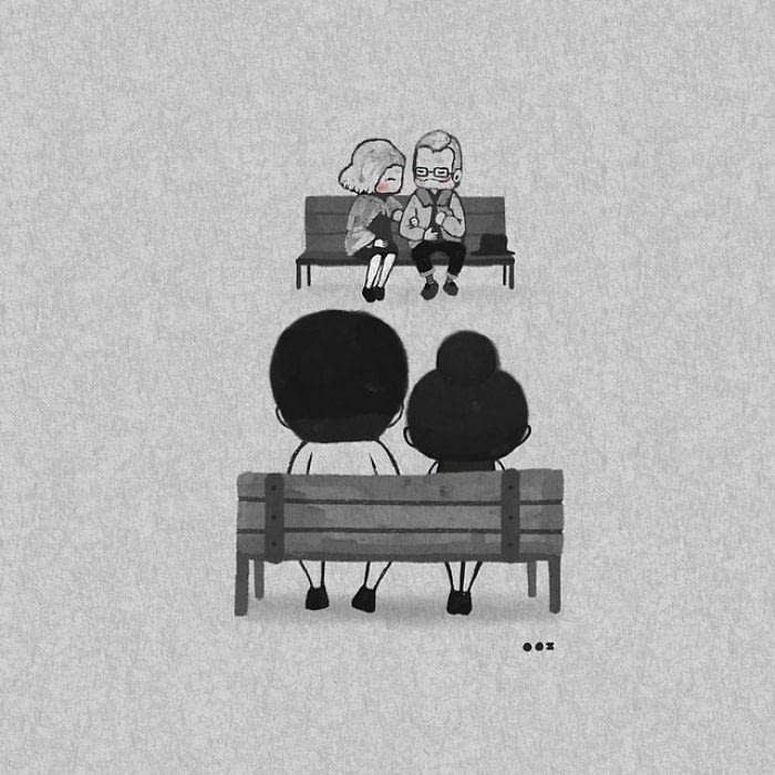 Young Joo Kim的插畫線條簡單,卻非常甜蜜。他沒有用太亮眼的顏色,反而用淡淡的灰色背景講述了最浪漫的愛情。遇到對的人,絕對不要放手啊~