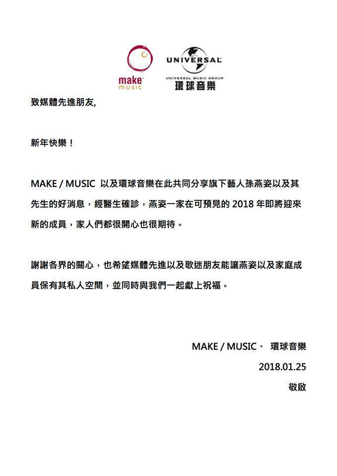 ▼孫燕姿的臉書貼出MAKE/MUSIC、環球音樂的聲明,證實她喜懷二寶,今年即將迎來新的成員。聲明中說:「謝謝各界關心,也希望各界能讓燕姿以及家庭成員保有其私人空間,並同時與我們一起獻上祝福。」