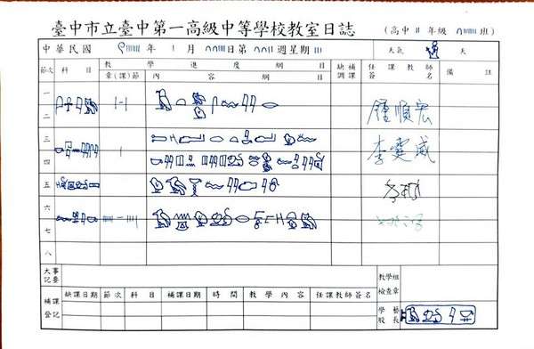 現在的學生真的好狂!有人在臉書社團貼出一名台中一中的教室日誌,只見裡頭以「古埃及象形文字」寫成,貼出後還真的有喜歡研究古文的網友破解了!