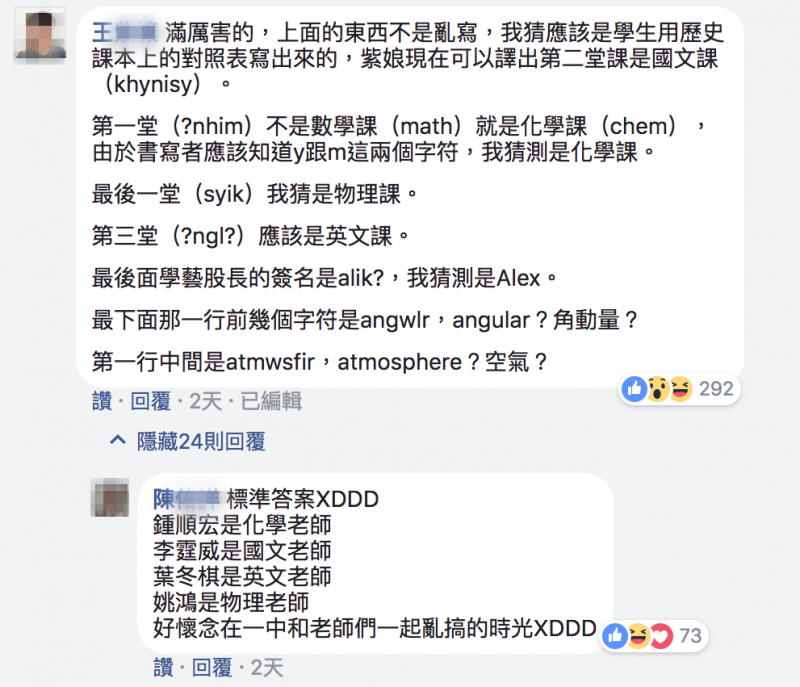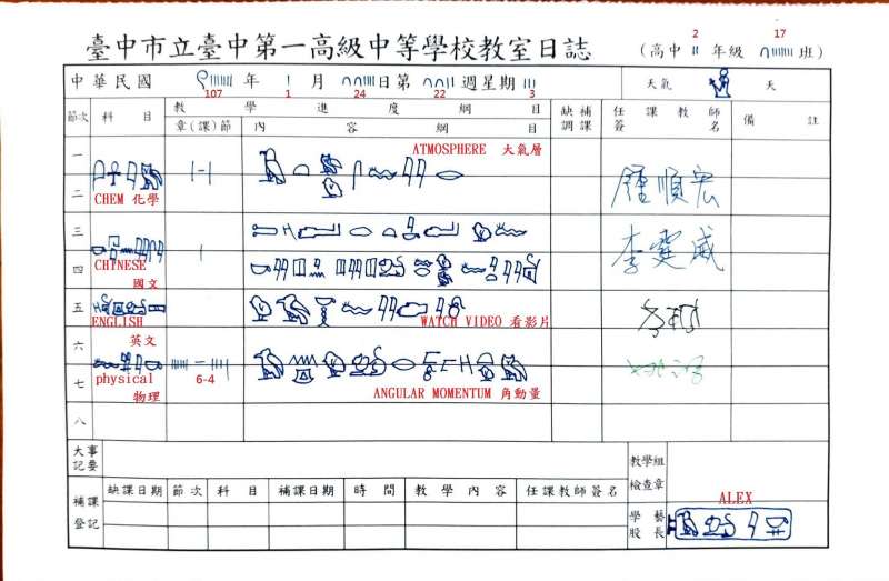 ▼但貼文出現後也有認真的網友破解,表示第一堂應該是數學或化學課,第三堂是英文,最後一堂是物理,最後學藝股長的簽名alik大該代表英文名字Alex。也有前一中學生出面證實,後面簽的的確是該科目的老師!