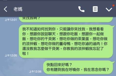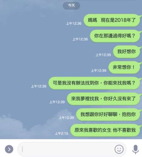 ▼每個月原PO總會有幾天會特別想念母親,無法控制地流淚,內心百感交集,思念母親,又深怕母親溫柔、慈祥的聲音在他心中會隨著時間而淡去,逐漸變得模糊。由於太思念,卻又無法在夢中找到母親,他只好把母親當作還在世時一樣,將想說的話都傳Line表達,但想起這些訊息再也不會被已讀,就令他感到悲痛萬分。