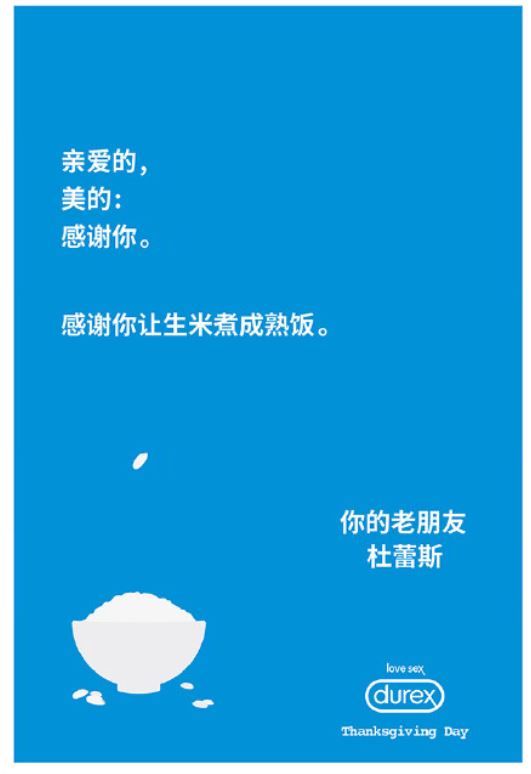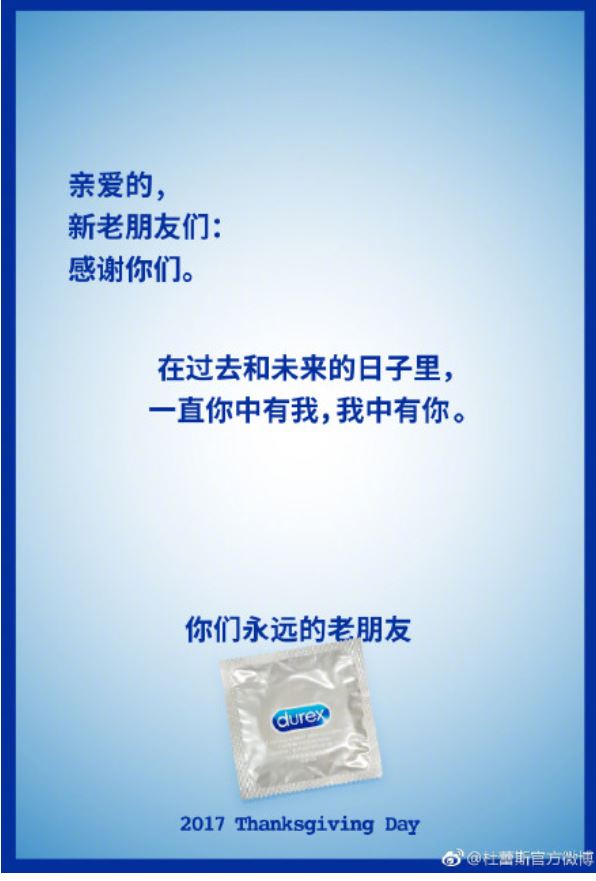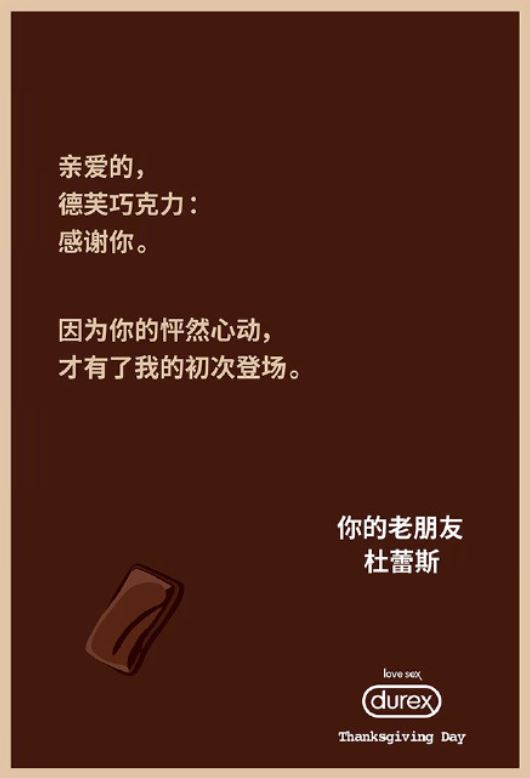 2018年01月27日每年11月最後一個星期四是感恩節,回到家中跟家人團聚,吃著火雞大餐,同時懷抱著感恩的心。去年保險套品牌,杜蕾斯就懷抱著「感恩的心,感謝有你~」的心情感謝各大品牌,不僅感謝各品牌,還順便將自己的商品行銷也包裝在裡面了!