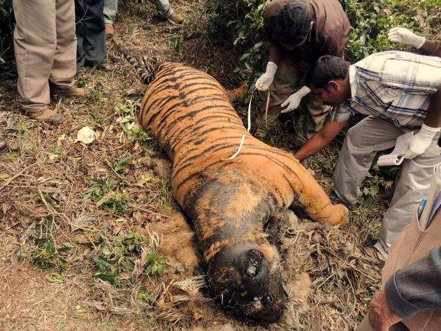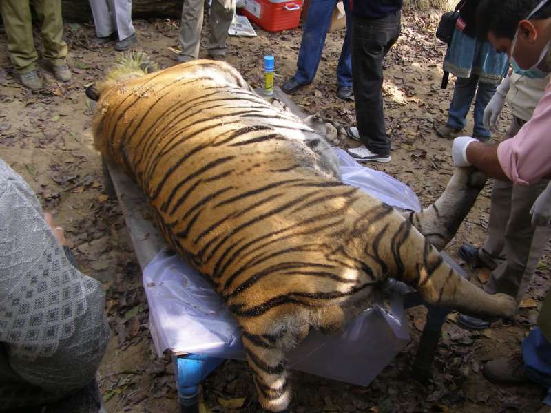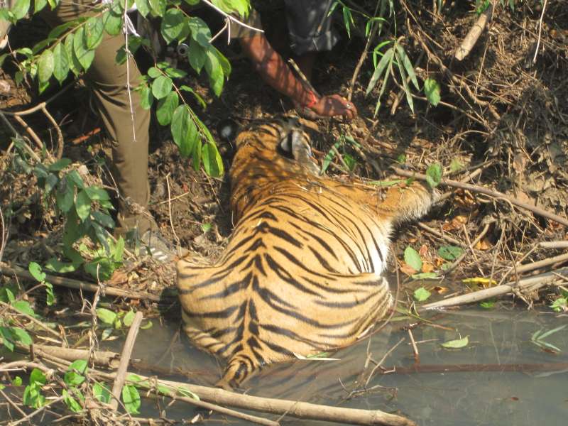 2018年01月29日在印度,一名男子在野外探險時,發現一隻體型碩大的老虎躺在河邊,虎頭埋在水裡一動也不動,他上前查看,才發現老虎已經死了,屍體腫脹,頭部發黑,明顯已經死亡多時。