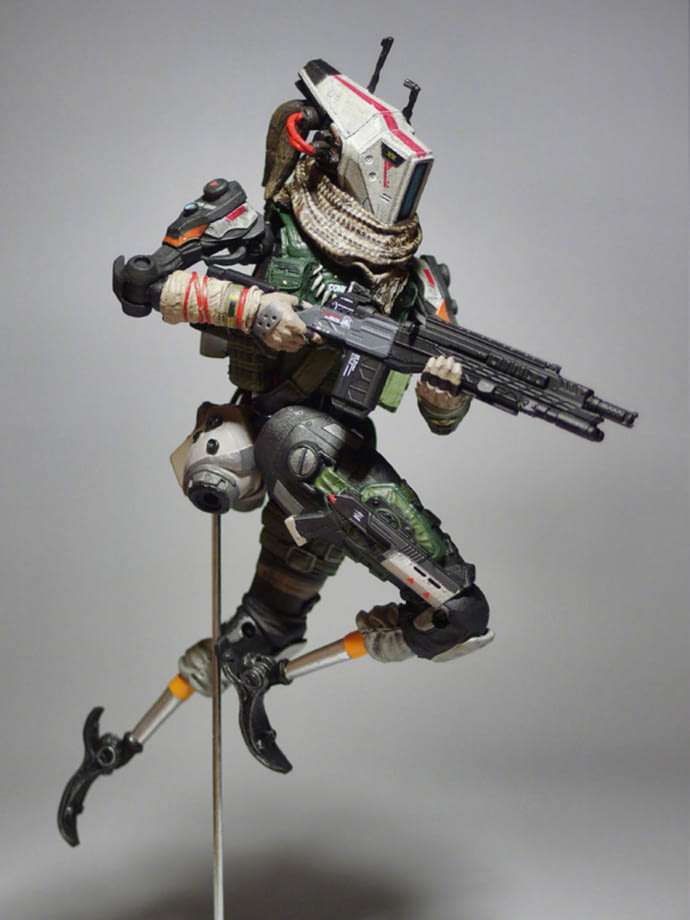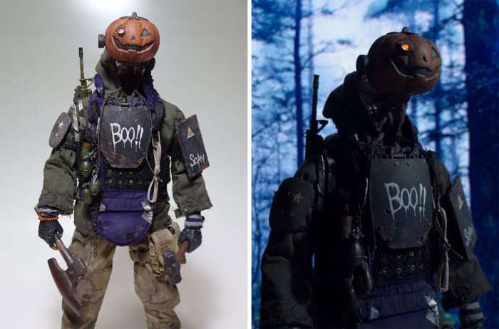 ▼他改裝了玩具的衣服、裝備,加上了防沙護目鏡、多口袋的擋風衣物、防幅射口罩頭盔等等。表面的塵垢污漬非常吸睛,讓人一下子想到絕望的沙漠。