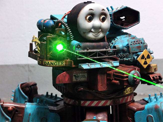 ▼Thomas火車頭被改裝成了坦克,還裝備有噴火器,除了臉上的笑容,跟原來截然不同。
