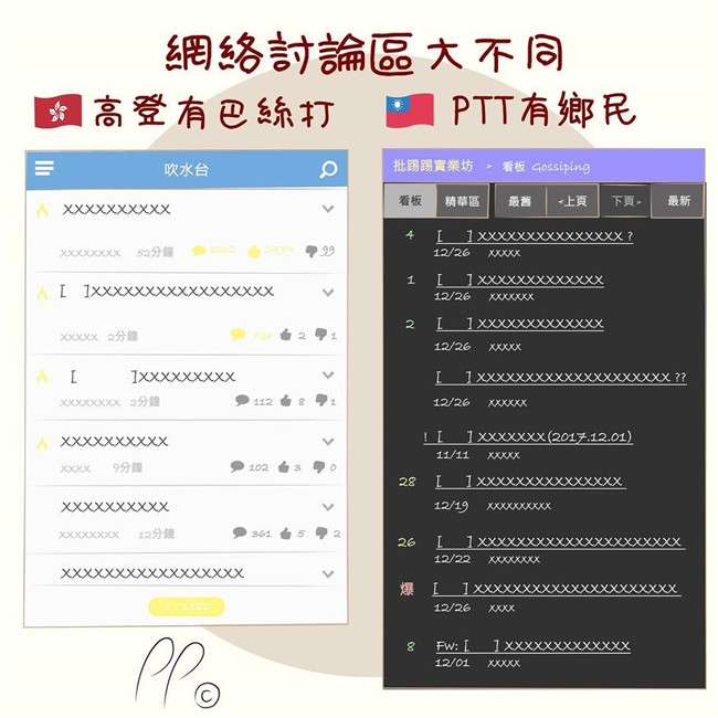 2018年01月31日香港是台灣人很喜歡的一個城市,雖然兩地距離很近,但是文化和生活差異卻很大,香港人生活節奏超快,而台灣人則相對悠閒,在飲食、娛樂、交通等方面也有大不同,一位在台中讀書的香港學生PPstory用插畫的形式,寫實的描繪了兩地的差異。