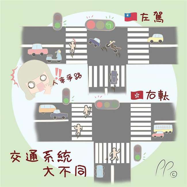 台灣和香港的交通系統大不同,一個是左邊駕駛,一個是右邊駕駛,讓PPstory很頭疼的就是,在台灣遇到綠燈,左轉的車子和行人會爭路,看起來很危險,但台灣人卻習以為常鎮定的過馬路。