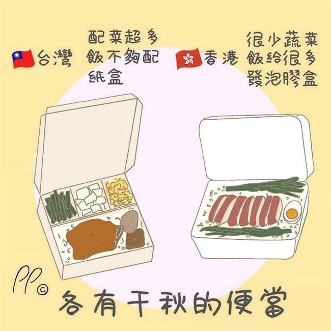台灣的便當菜色多元,各種口味任你挑選,多用紙盒來裝,而香港的便當飯給很多,特色的燒臘別有一番風味,多用發泡膠盒來裝。