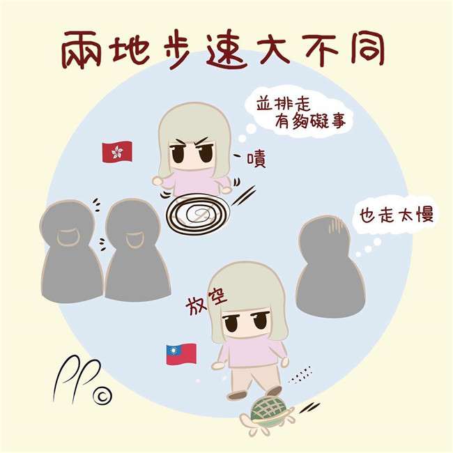 香港人走起路來風風火火,速度超快,好像每個人都在趕時間,而台灣人則喜歡悠閒逛街、放空。
