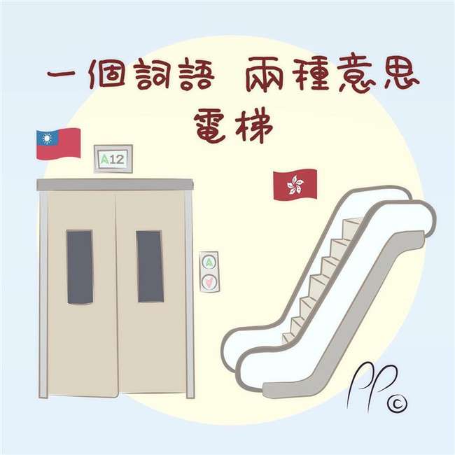 台灣人說的「電梯」,香港人叫做「升降梯」,而台灣人說的「手扶梯」,港人稱作「扶手電梯」。