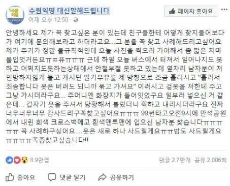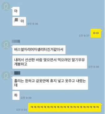 ▼這位女生在臉書《수원익명 대신말해드립니다》上發文,希望網友幫她找出這位溫暖的「草莓牛奶歐巴」讓她能夠當面對他道謝。原來事發當日她穿著短裙搭公車時,一向經期不定時的她無預警的流出的經血,這些經血順著她的大腿流了下來,當時女生尷尬得覺得自己一輩子都無法站起來了。