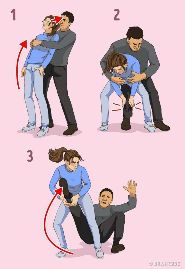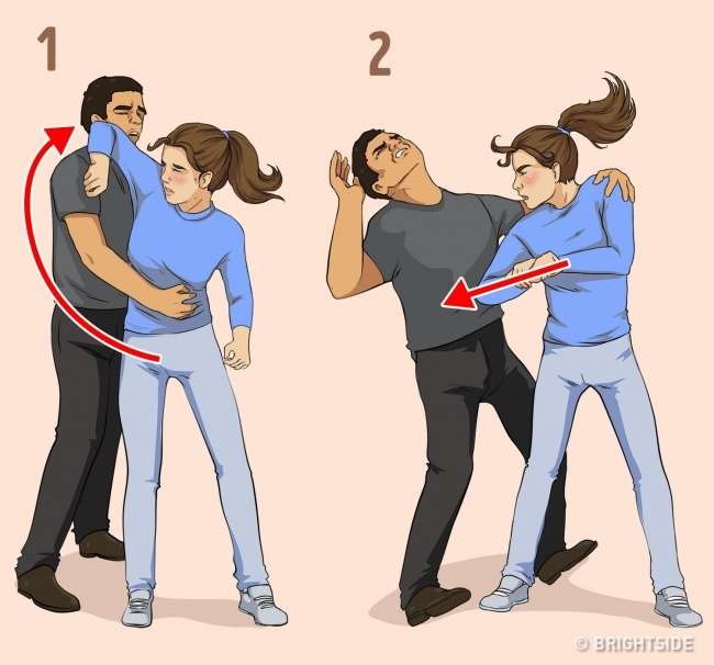 攻擊者經常從背後現身,因為這是最好制住被害人手臂的方法。為了甩脫這樣的擒抱,可以快速往後彎腰,用後腦撞擊攻擊者,如果你做不到也沒關係,關鍵是要讓攻擊者一條腿在前方,彎腰抓住他的小腿,用身體的力量往上拉,攻擊者就會頓時失去平衡,摔倒在地。