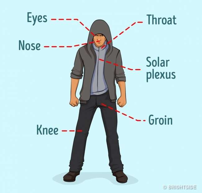 不管襲擊你的人有多魁梧,只要掌握住人體脆弱處,你就可以擊敗他。這些脆弱處主要是眼睛、鼻子、喉嚨、心口、膝蓋、鼠蹊部。最有效的防禦方式就是瞄準這些地方攻擊。