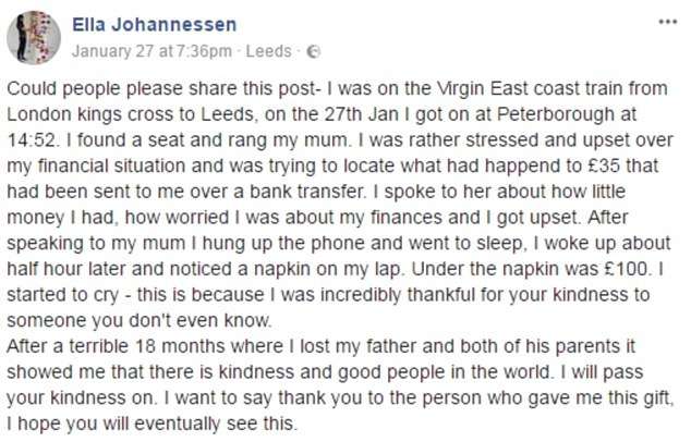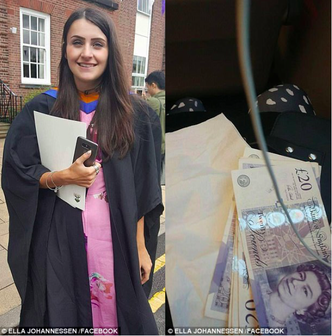 2018年02月02日英國23歲女孩Ella Johannessen在利茲貝克特大學讀研究所。18個月前,她失去了父親和爺爺奶奶,心中非常悲痛。為了專注學業,她把打工辭掉,手頭也拮据了起來。前幾天,她在轉帳過程中遺失了35英鎊(約1436新台幣),情緒非常低落。