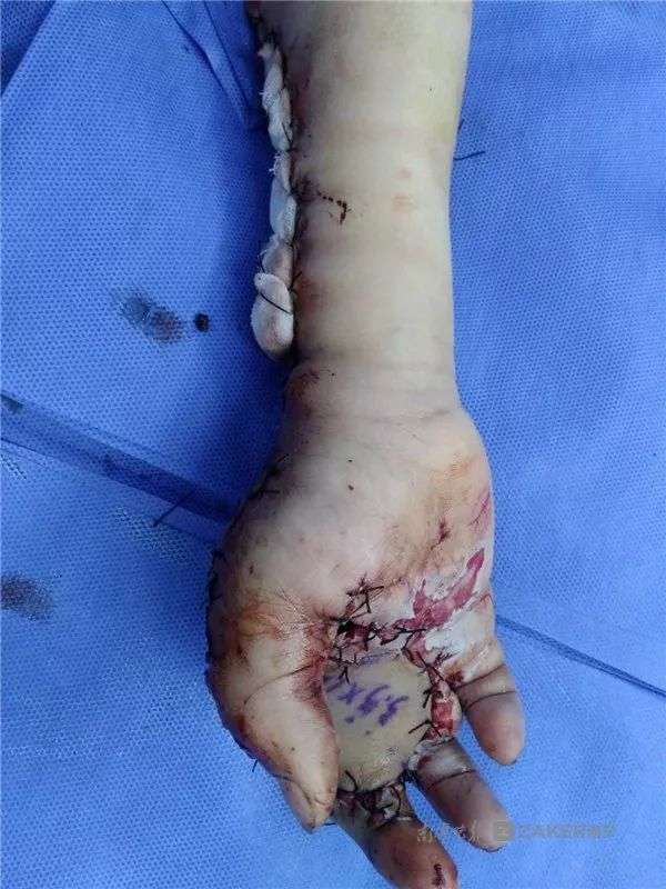 ▼小明的右手食指被炸飛,其他手指受傷,眼睛也被炸傷了。他又痛又怕,直接暈了過去。家人連忙帶他去醫院治療,經過檢查,小明的眼球有異物、肺部挫傷、右手臂和手指有粉碎傷。醫生立刻為他做前臂皮瓣轉移修復術、拇指、中指、環指再植手術。