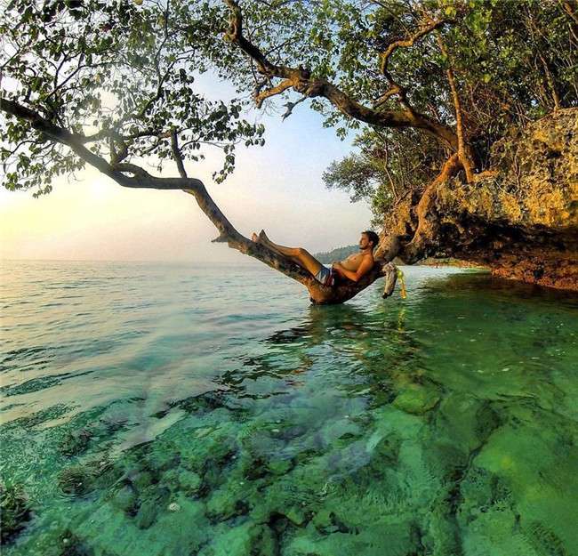 ▼躺在水上的樹杈上放空,畫面也太美好了!