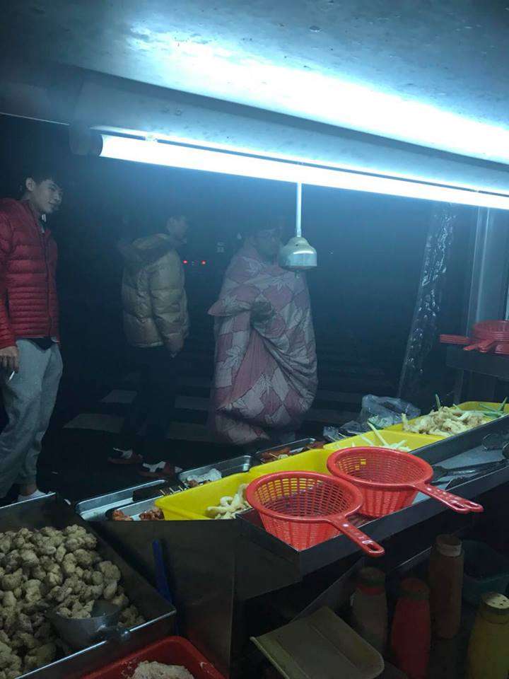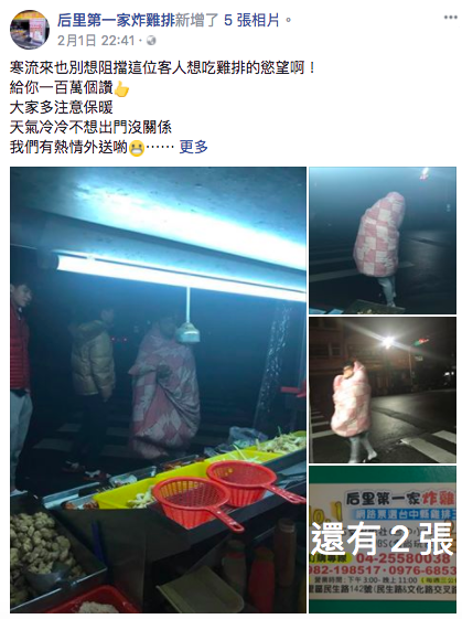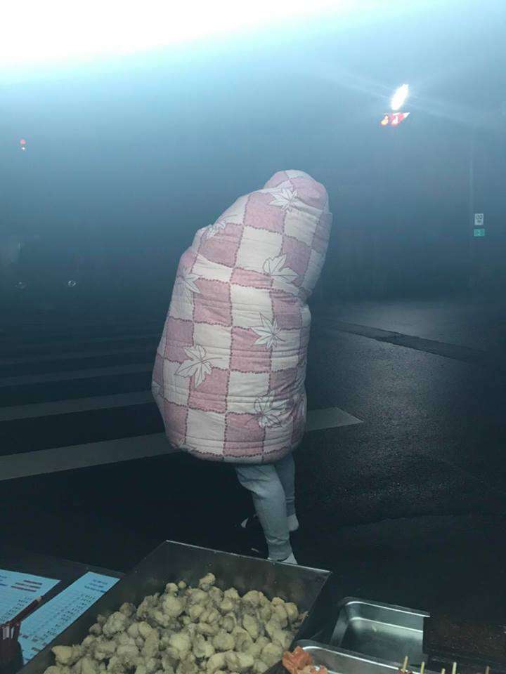 ▼2月1日,台中后里一家雞排店老闆發現超神奇的顧客,拍照PO文和大家分享。照片中,一男子裹著家裡的暖被,到攤前點餐。老闆忍不住讚嘆:「寒流來也別想阻擋這位客人想吃雞排的慾望啊!」