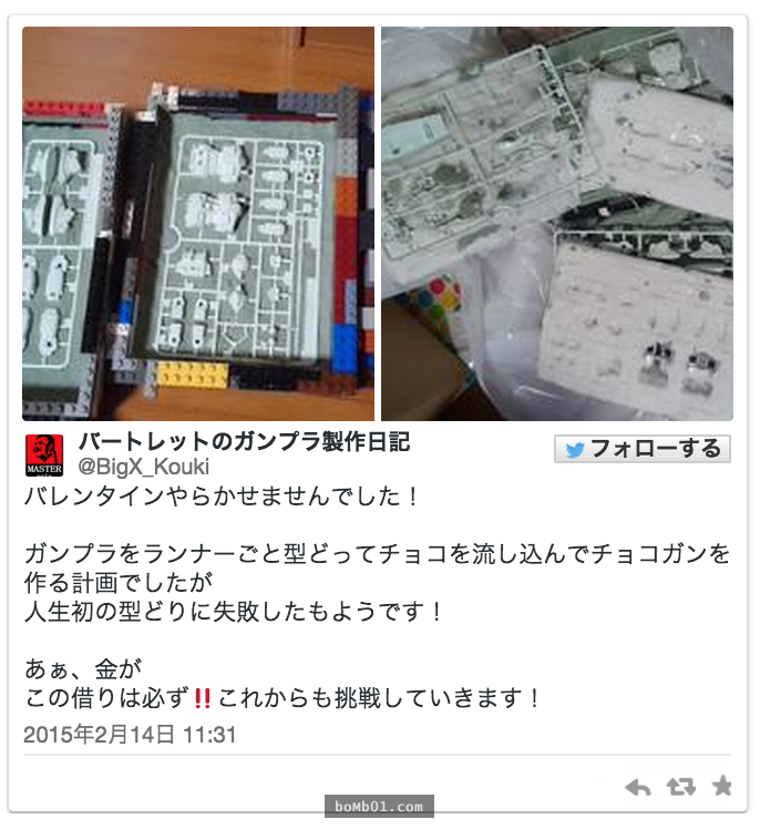 ▼「用鋼彈模型和支架倒入巧克力製作巧克力!人生第一次做失敗也正常的吧!」