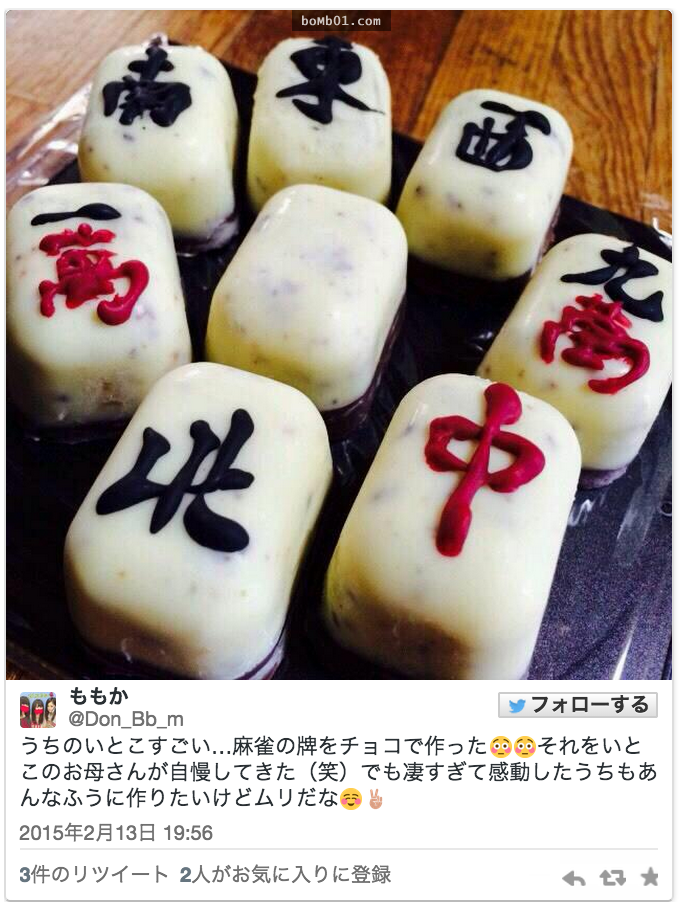 ▼「家中的表兄弟做了麻將巧克力!還向媽媽炫耀一番!非常感動,我也好想做,但我清楚自己一定做不來…」