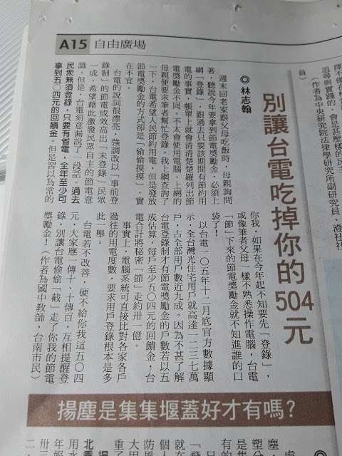 ▼原來這是台電舉行的「107年節電獎勵活動」,只要今年的用電度數比去年的同期少,每節省一度電可以領取0.6元的獎勵金,每省一度電就享受84元的折抵,一年最少省下504元。