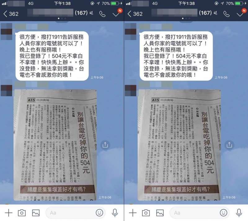 ▼LINE群中的文章分享到「很方便,撥打1911告訴服務人員你家的電號就可以了!晚上也有服務哦!我已登錄了!504元不拿白不拿哩!快快馬上辦,你沒登錄,無法拿到獎勵,台電也不會感激你的哦!」隨後附上一張新聞報導的說明,只要登陸電表電號真的可以享受獎勵。