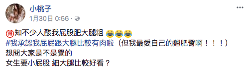 ▼然而,人紅是非多,不少網友開始批判小桃子「屁股肥大腿粗」。針對各種負面發言,小桃子樂觀回應:「承認我屁屁跟大腿比較有肉,但我最愛自己的俏肥臀啊!!!」