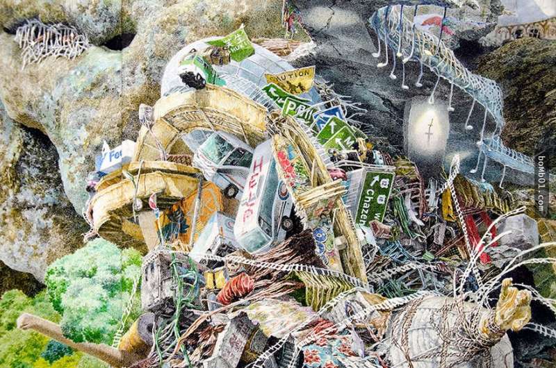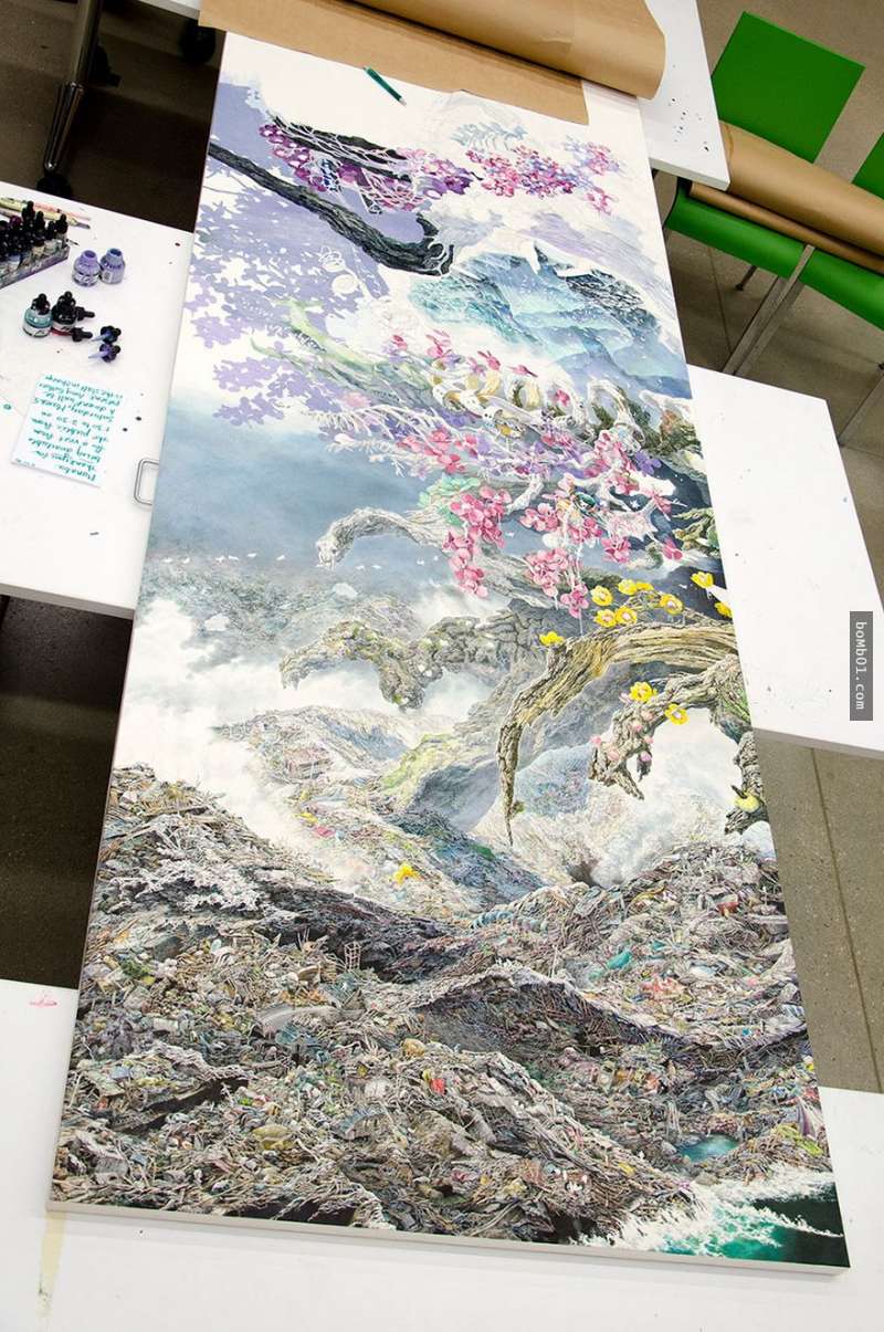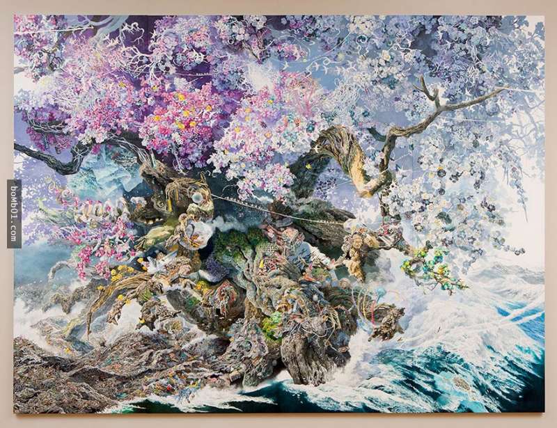 ▼他描繪了一棵經歷恐怖海嘯的大樹,如果看得仔細一些,會發現裡面有很多微小的細節。
