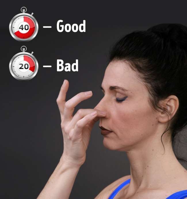 5分鐘後,再度深呼吸,然後一樣呼一大口氣,在吸氣屏住。健康的一般人可以有大約25-40秒的紀錄,運動員可以憋得更久,所以從你的成果可以看出你身體的鍛鍊程度。