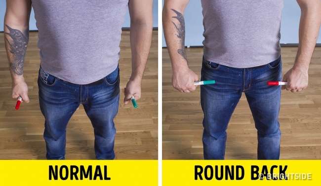 ▼還有一個測試能看出你有沒有圓肩,手裡握著兩支筆輕鬆垂下,如果筆自然平行,代表你姿勢正確,如果筆有指向另一方,就代表你有圓肩問題。