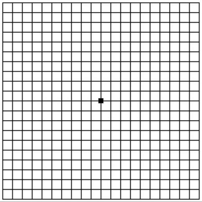 測試應要在一個光線充足的空間進行,讓你的眼睛直視這張方格表,不要傾斜或斜視,距離保持在25-40公分左右。用手遮住一隻眼睛,不眨眼凝視中央的黑點十秒鐘,然後換另外一隻眼睛。
