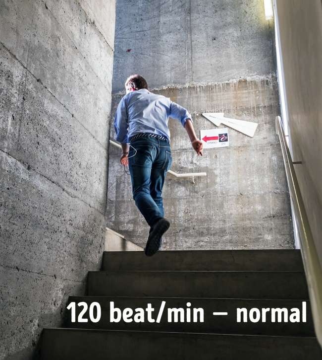 ▼另外,還有一個測試是走到四樓,不要用奔跑的,單純往上爬,但也不要拖延腳步。結束後計算你的每分鐘脈搏,假設是落在120次左右,那還很正常,但要是超過120次,或是引發氣喘或胸痛,就該去看醫生。