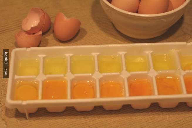 1.把新鮮雞蛋的蛋白和蛋黃分開、各自倒入較大製冰盒裡