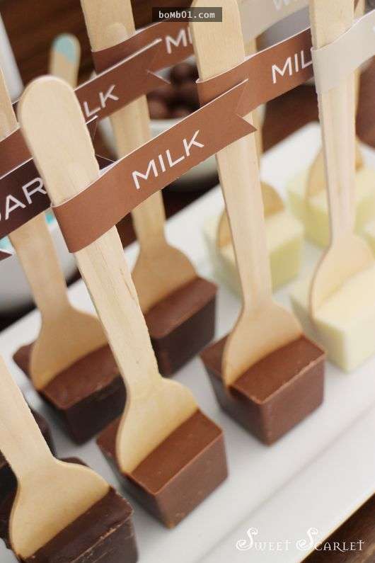 就這樣一口一個的時尚感巧克力。這是利用加入了熱牛奶的熱巧克力來製作美味的巧克力棒!木棒可在百元商店買到,簡單地製作出時尚又美味的巧克力棒,當作小心思的禮物相信對方一定很高興!