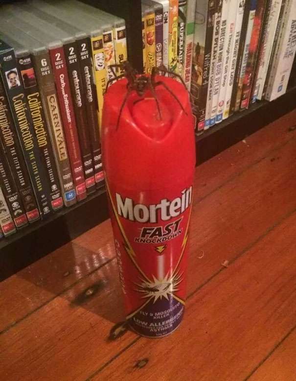 ▼蜘蛛就趴在殺蟲劑上,該如何是好…