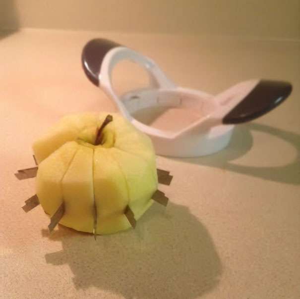 ▼蘋果切片器切到一半故障,變成一顆超危險的蘋果了。